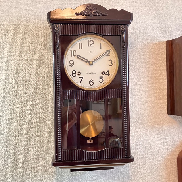 昭和レトロ 精工舎 宮型本打ち掛時計 オーバーホール済 稼働品です。 精工舎は、現在のSEIKO、1892年に服部金太郎が服部時計店を銀座に創業、時計の製造部門として精工舎を立ち上げました。 以来、数々の時計を製造し続けた、時計の老舗です。 この時計は、昭和レトロな昭和30年頃の製造と思われます。こげ茶のシックで落ち着いた風合いのオーソドックスな小ぶりな宮型時計です。 分解清掃・注油 オーバーホール済み 調整完了の稼働品です。 8日巻き 日差2分以内 誤差の少ない、巻き始めから安定して精度が出るいい機械です。 本打ちの機械は、短針とボン打ちの数がずれる事がなく、時間合わせが楽です。 30分にも1回打ちます。 ボン打ちの音は、渦鈴で低目で太めの音です。 文字盤は、当時のオリジナルのもので汚れもなく比較的きれいです。 箱には、経年による擦り傷や打ち傷など時代相応の劣化が見られますが、小さな傷はチークオイルでメンテナンスして目立たなくしています。 振り子室窓右上の波板が収縮して、飾りとの間に隙間ができていましたので、木質パテで埋めて補修しています。同様に、裏側の底飾りとの僅かな隙間もパテ埋め補修しました。 稼働する骨董品ですが、最近入荷する中では、比較的状態の良い個体です。 振り子と巻鍵が付属します。 大きさは、縦48cm 横24cm 厚さ13.5cm リビングやお店でも映える飽きのこない落ち着いシンプルなデザインです。 作動保証は、1年。着払いで無償で修理いたします。また、その後3年間は、送料を御負担頂ければ無料で修理いたします。その場合消耗部品代を請求させて頂く場合もあります。ただし、保証は通常の使用が対象で、自然災害や落下、人為的に起こした破損や不具合は対象外です。ご購入後もサポートをいたしますので、安心してお使い下さい。 落ち着いたオーソドックスなデザインの精工舎の掛時計です。この機会にぜひお求めください。