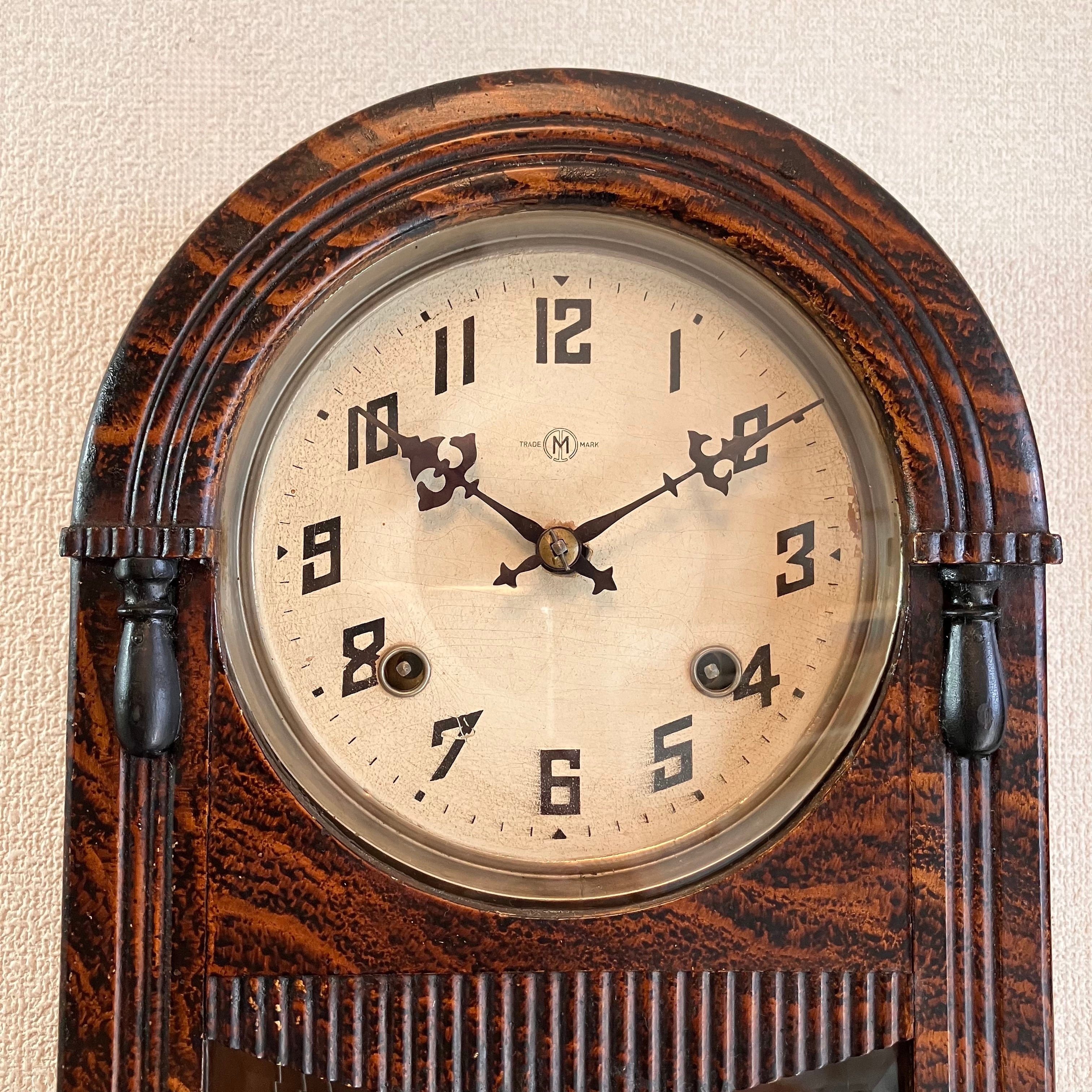 昭和初期のモダンな雰囲気を随所に感じる個性あふれる時計です。大きさも小ぶりで和洋どちらにも合わせやすく、リビングや店舗のインテリアとしてもとても映える良い時計です。