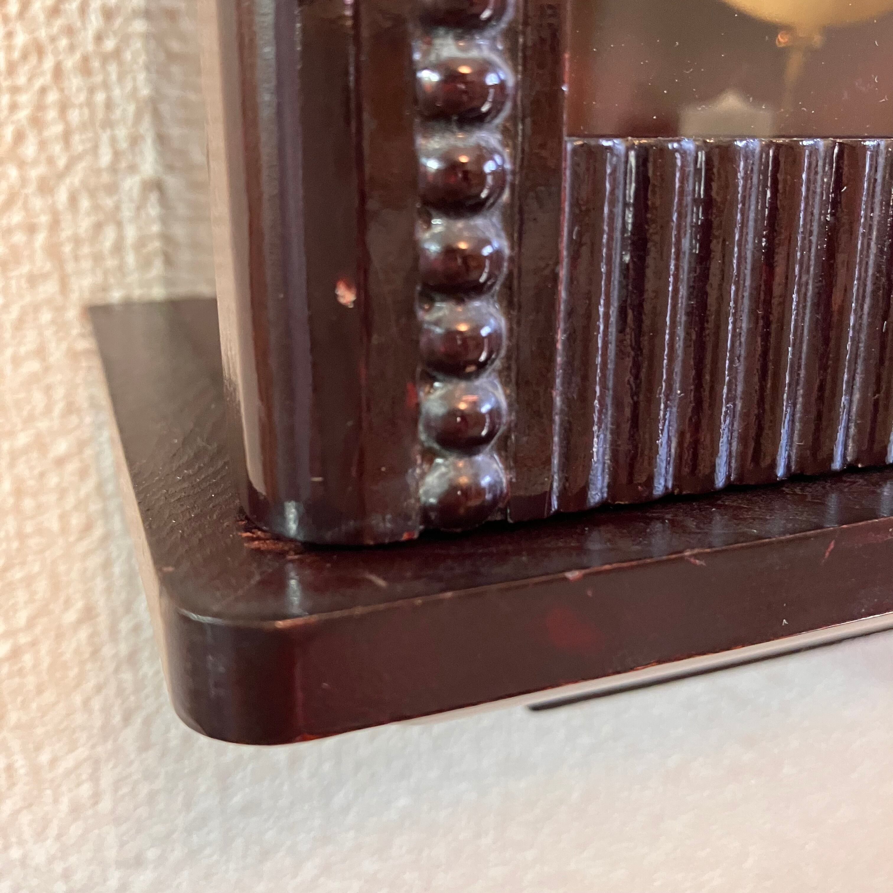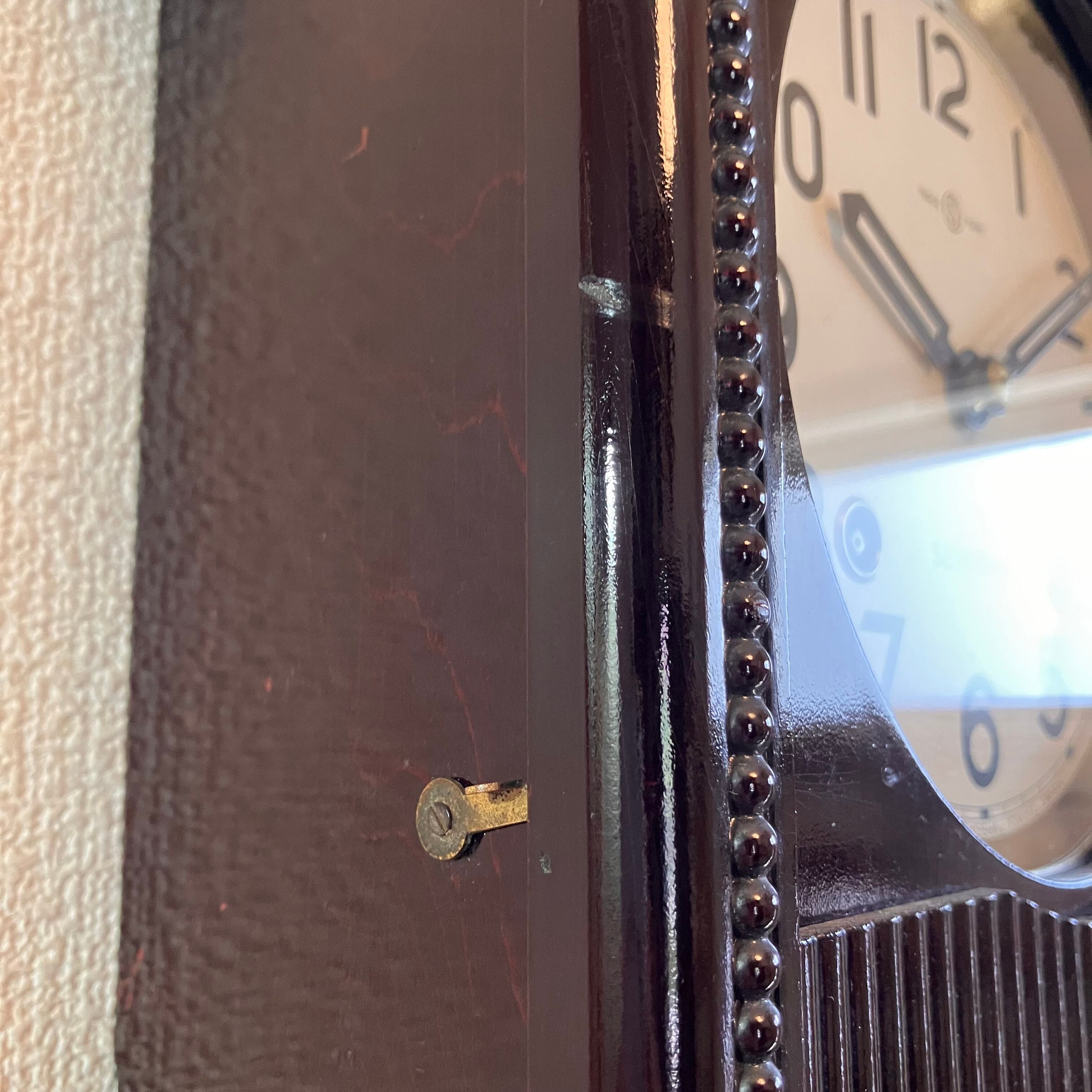 この時計は、昭和レトロな昭和30年頃の製造と思われます。こげ茶のシックで落ち着いた風合いのオーソドックスな小ぶりな宮型時計です。