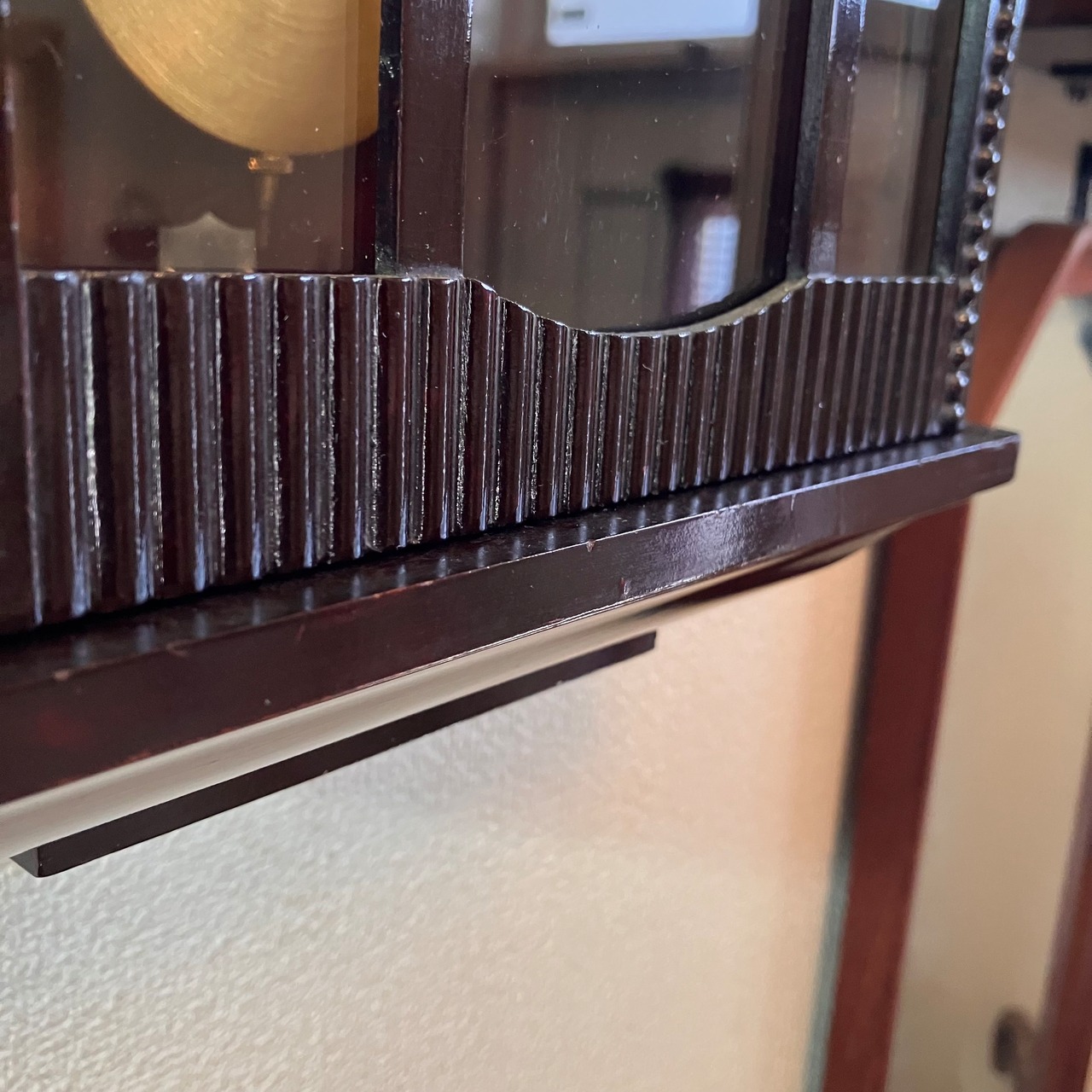 入手時振り子窓のガラスが欠損していましたので、同時代の時計ガラスをカットして入れています。