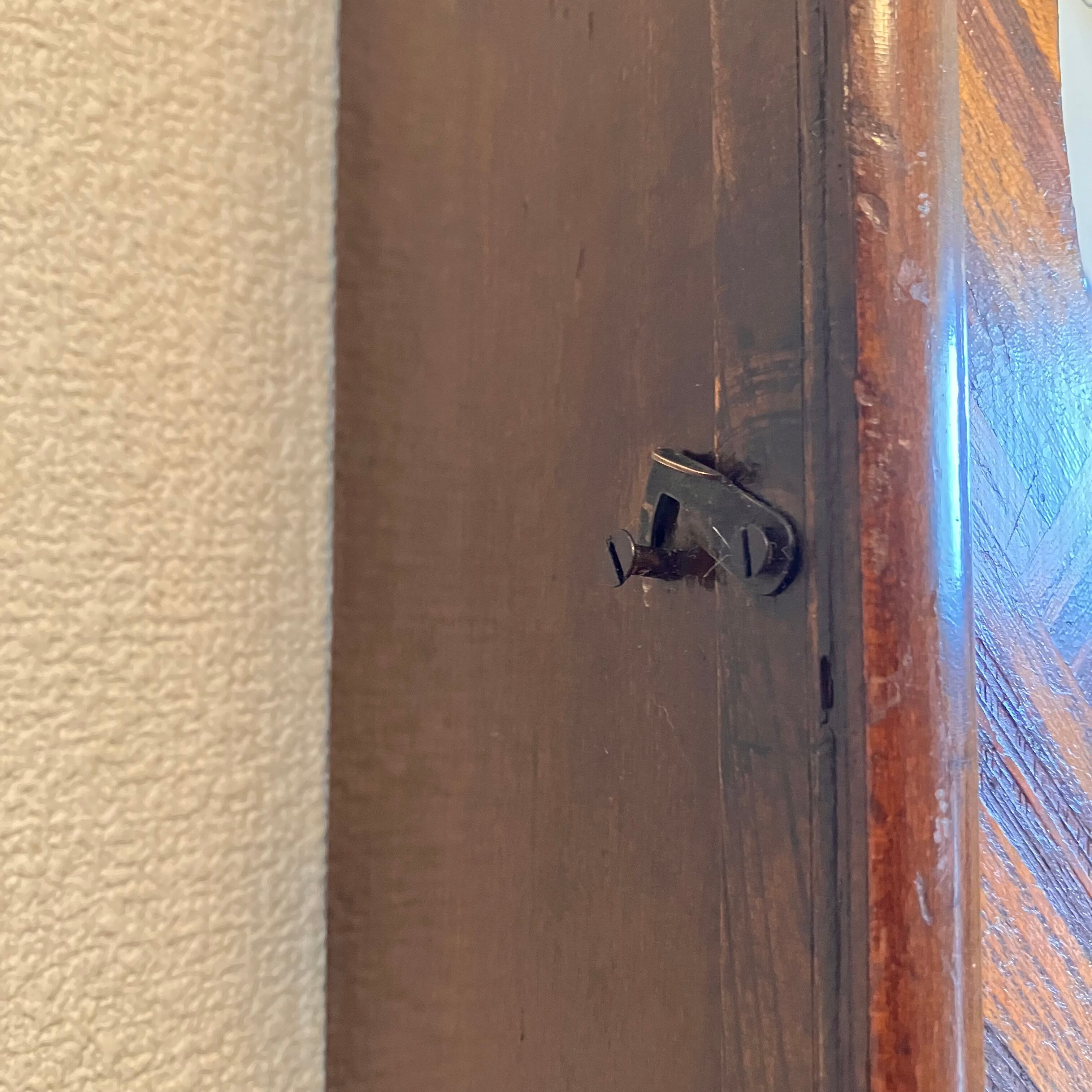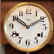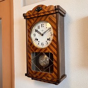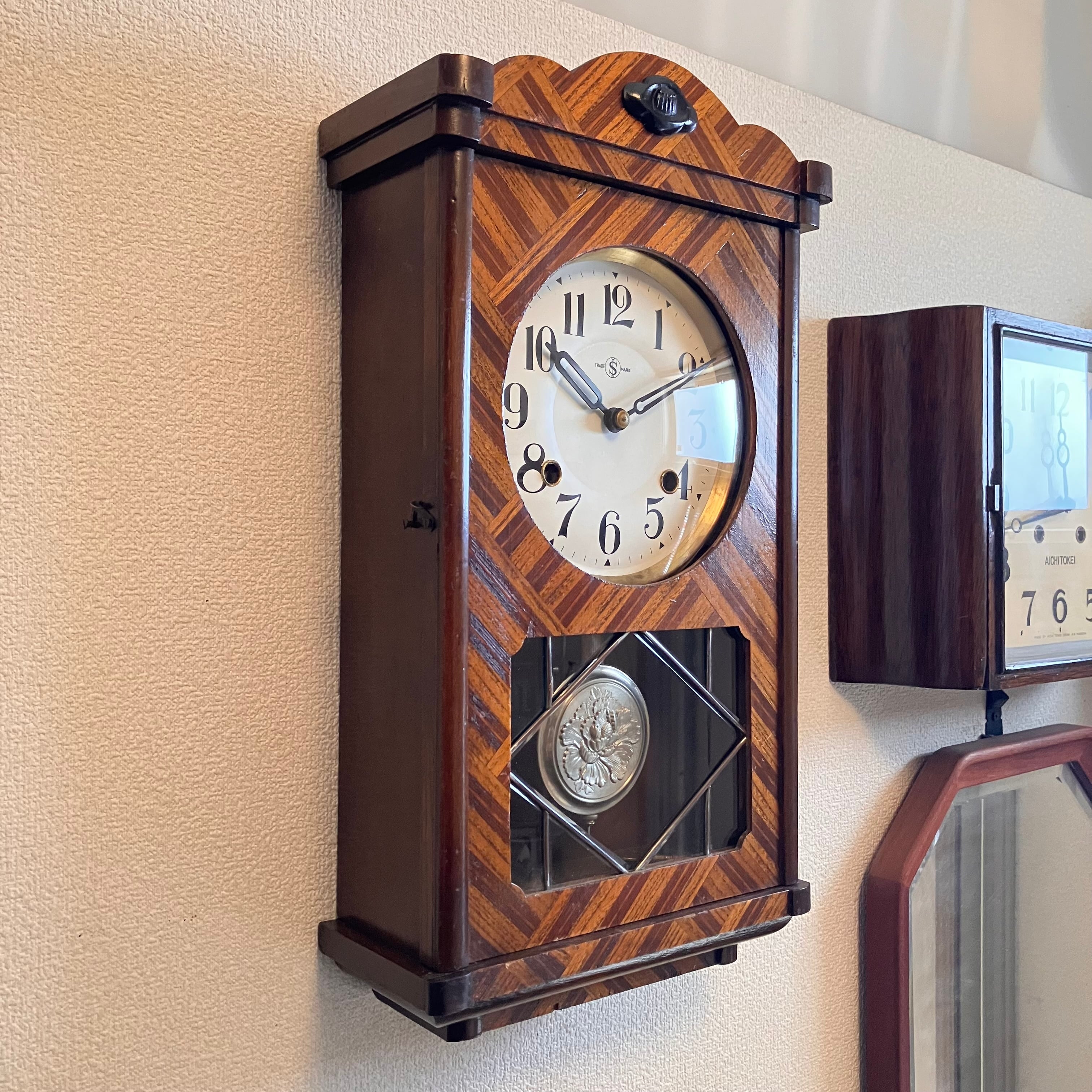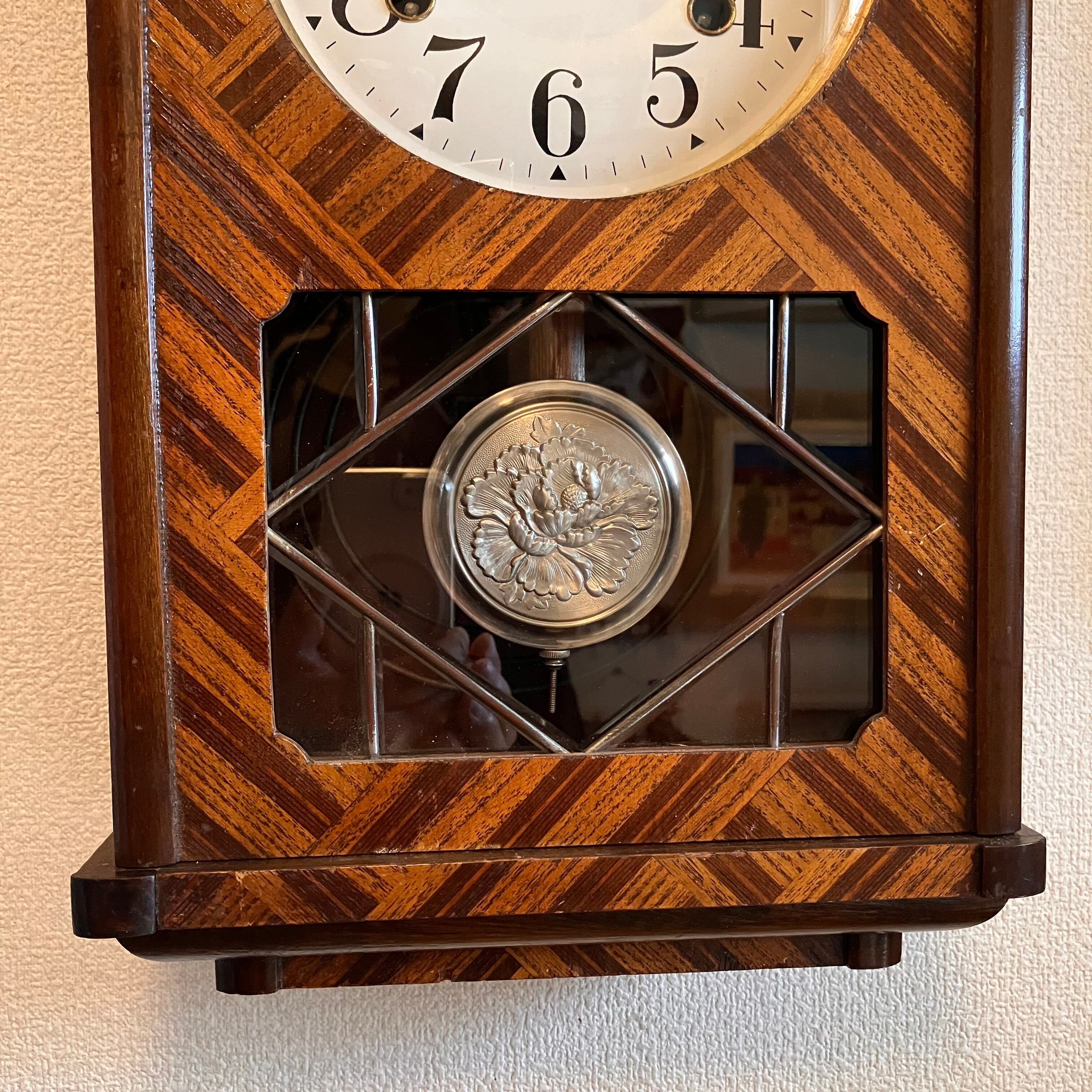 この時計は、昭和初期頃の製造と思われ、当時の木工加工で最高級とされる寄木張りの扉にダイヤのステンドガラス調の振り子窓が施された個性的で粋な時計です。ガラスには桟の形に合わせて切子加工が施されており、ステンド調をより引き立てています。
