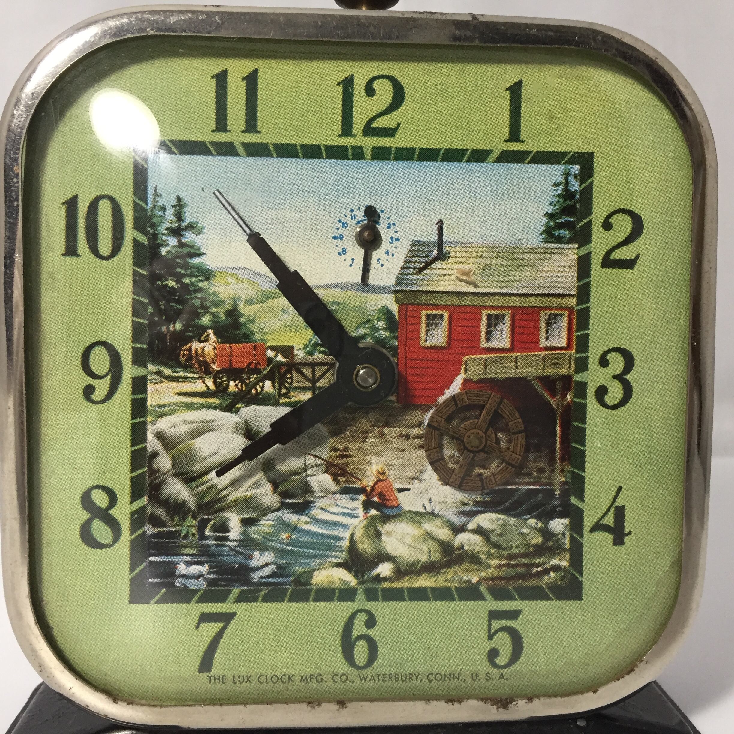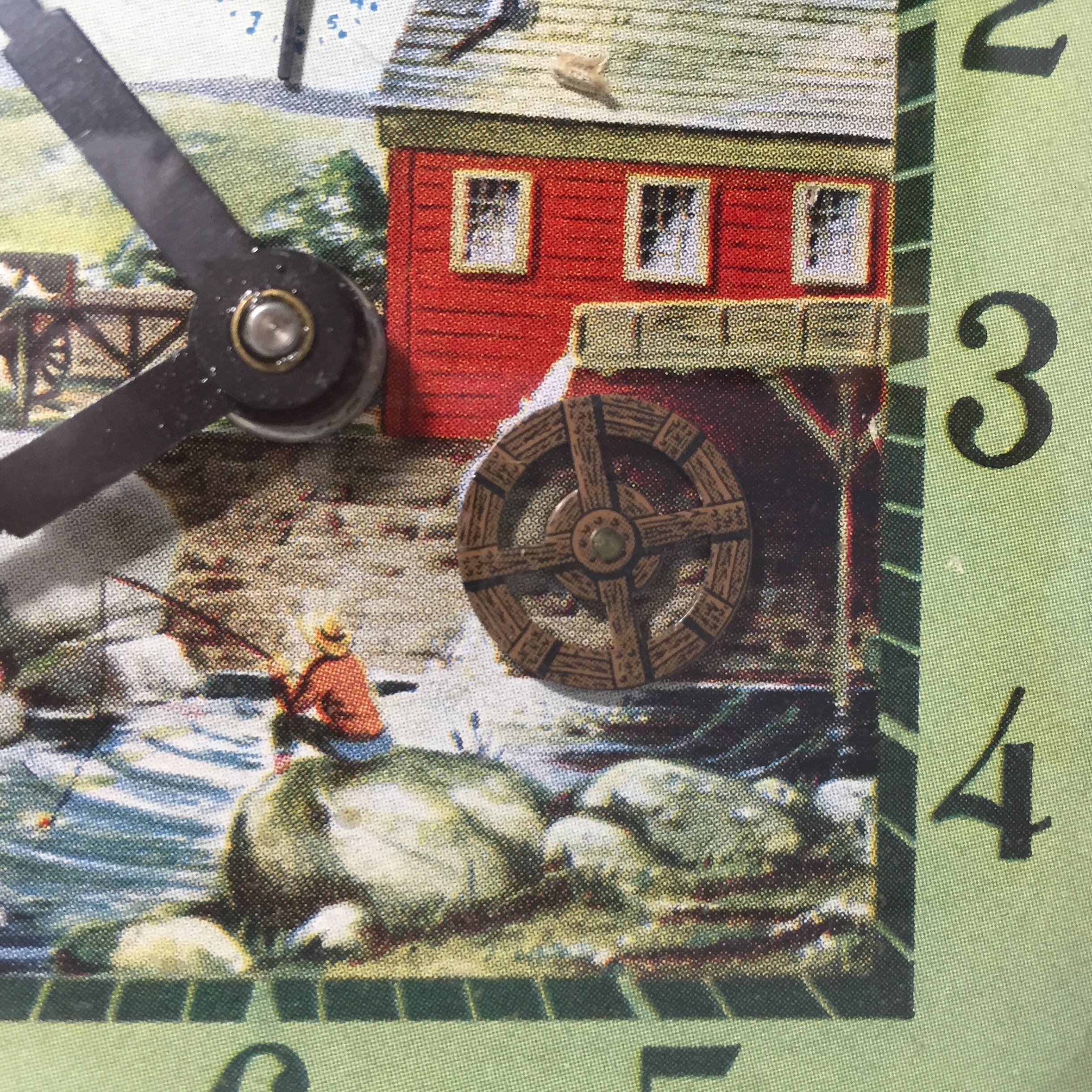 ウオータベリーのラックス(Lax clock)社製です。秒針の代わりに、小屋の水車が回る仕掛けになっています。アメリカの原風景のイラストです。