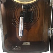 この時計は、ケヤキの美しい木目を生かした板を表に使用し、当時珍しかった球面ガラスを採用、振り子室には、3枚のカットガラスを使っています。