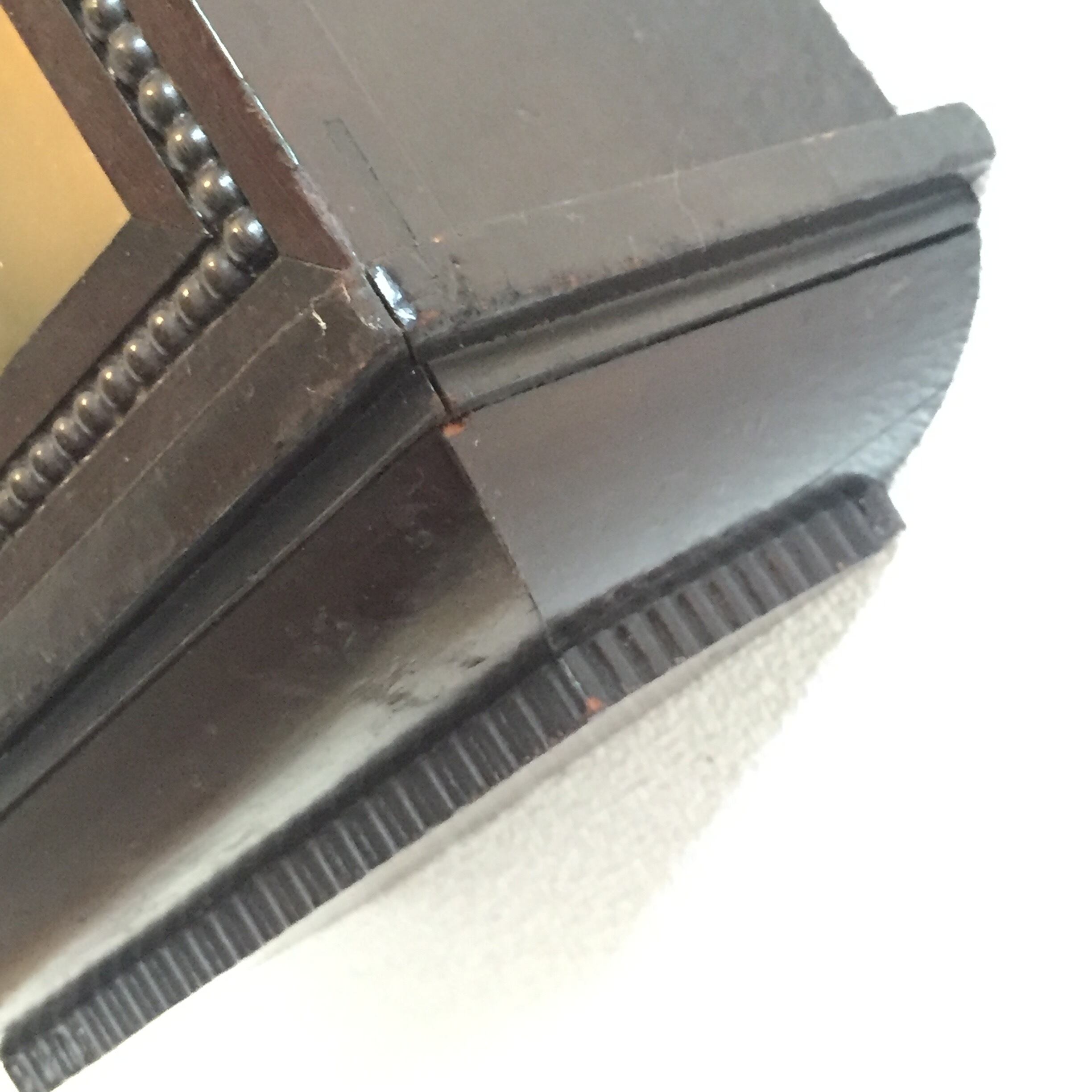 この時計は、戦後昭和30年頃の製造と思われます。こげ茶の落ち着いた色合いの飽きのこないオーソドックスな宮型時計です。