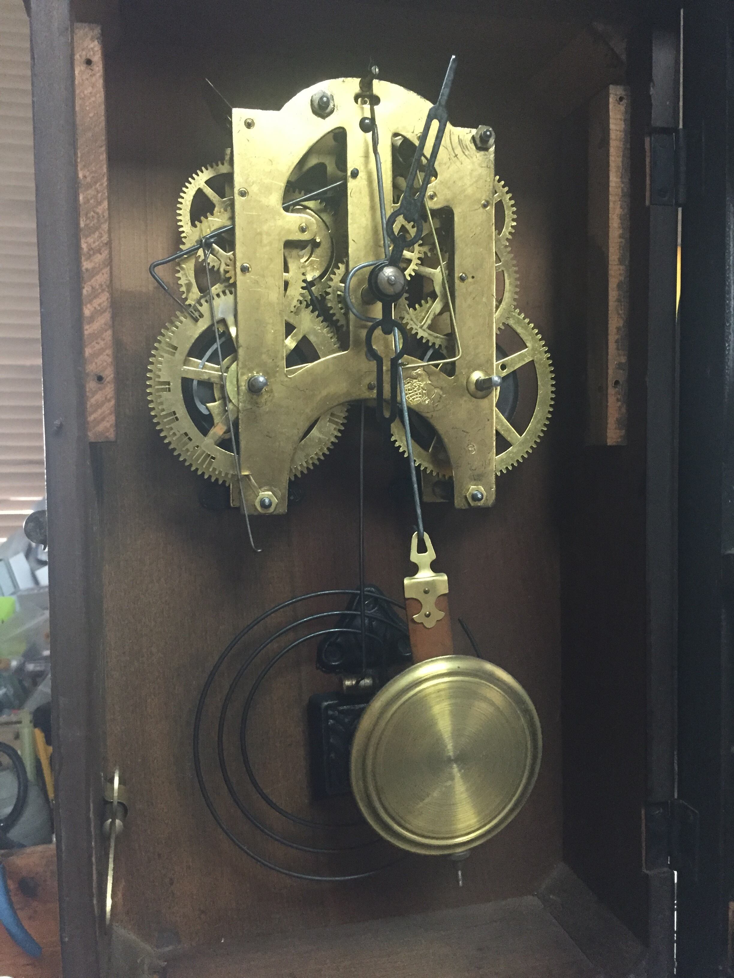 この時計は、戦後昭和30年頃の製造と思われます。こげ茶の落ち着いた色合いの飽きのこないオーソドックスな宮型時計です。
