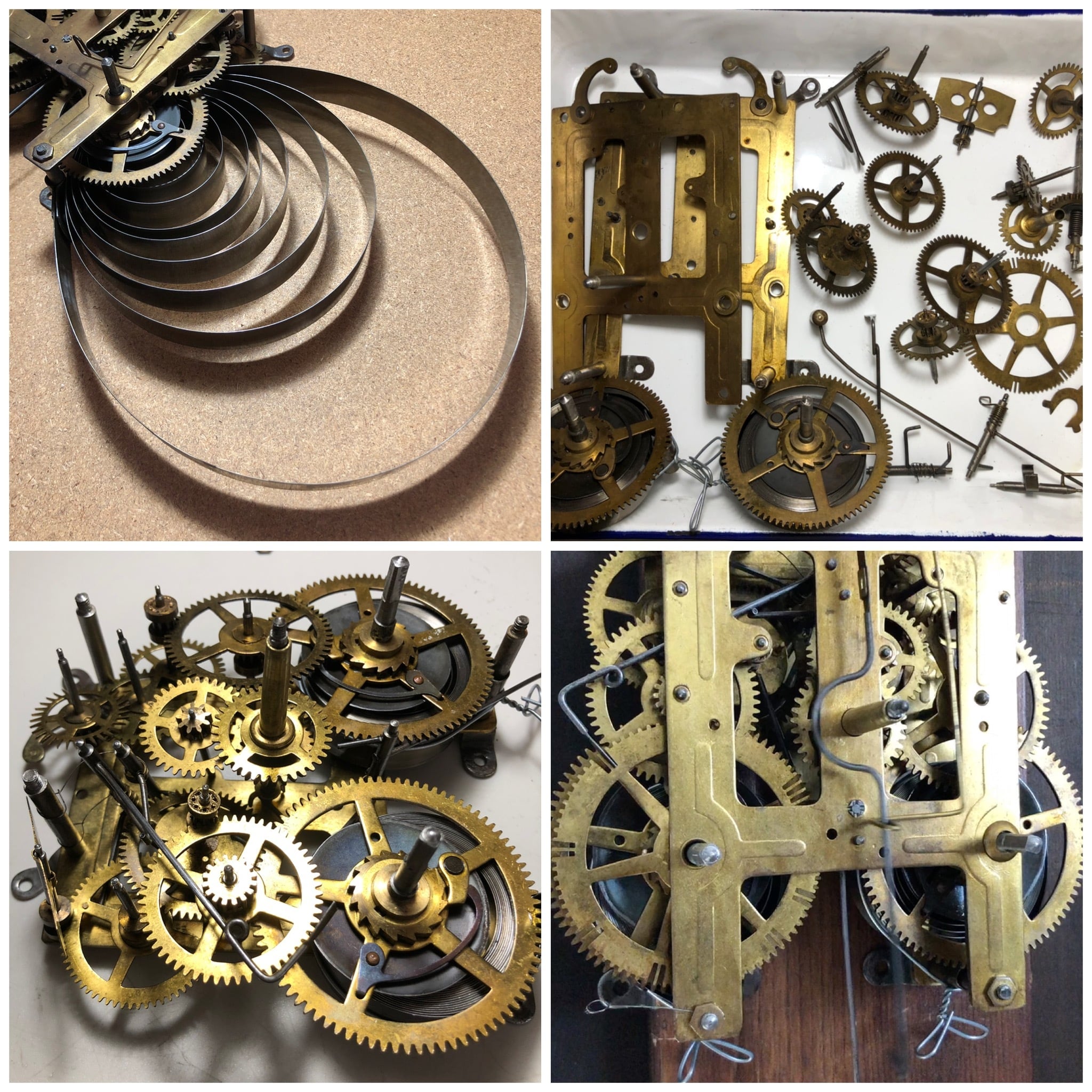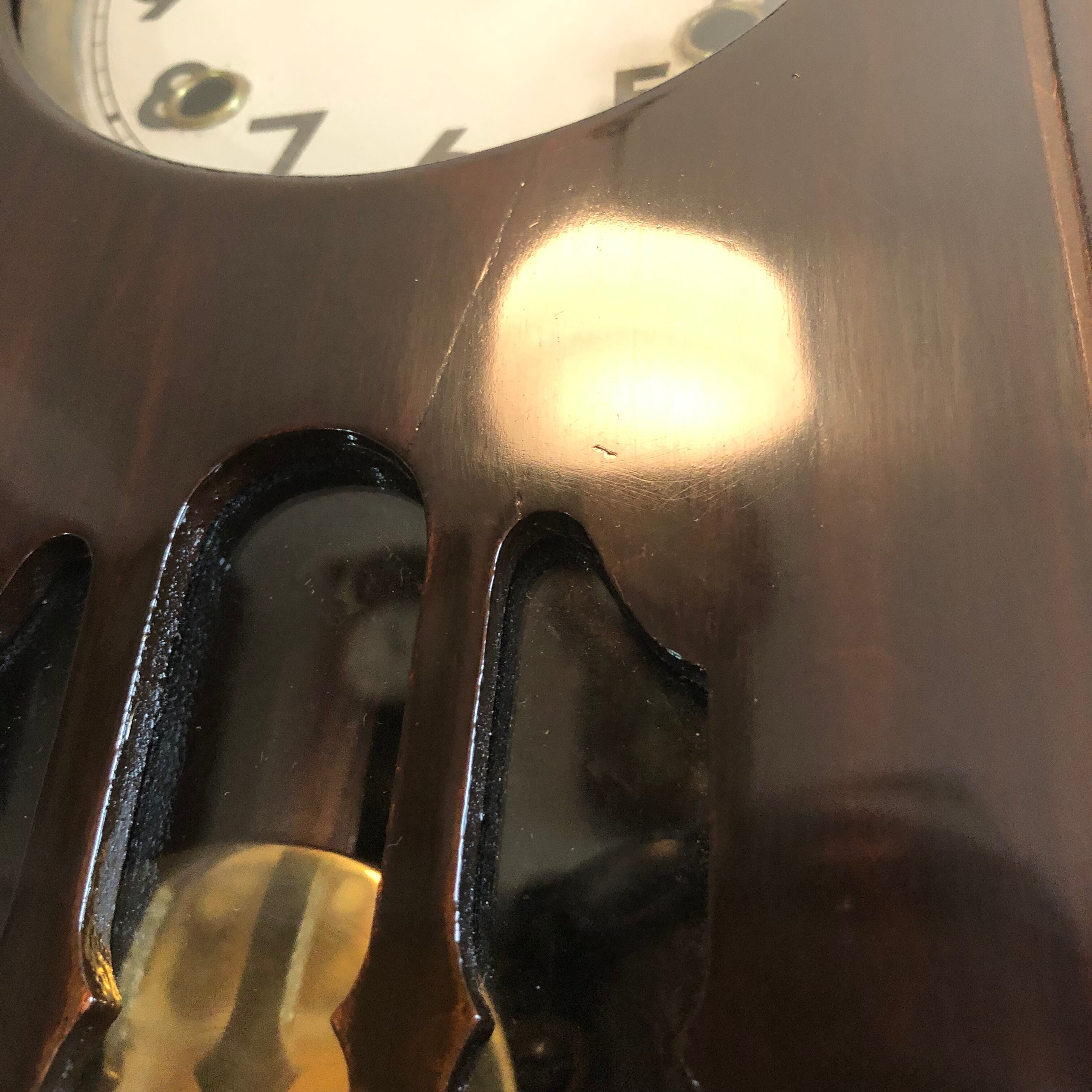 この時計は、小ぶりで、振り子窓の一枚板のくり抜きにレトロ感がある可愛らしい時計です。