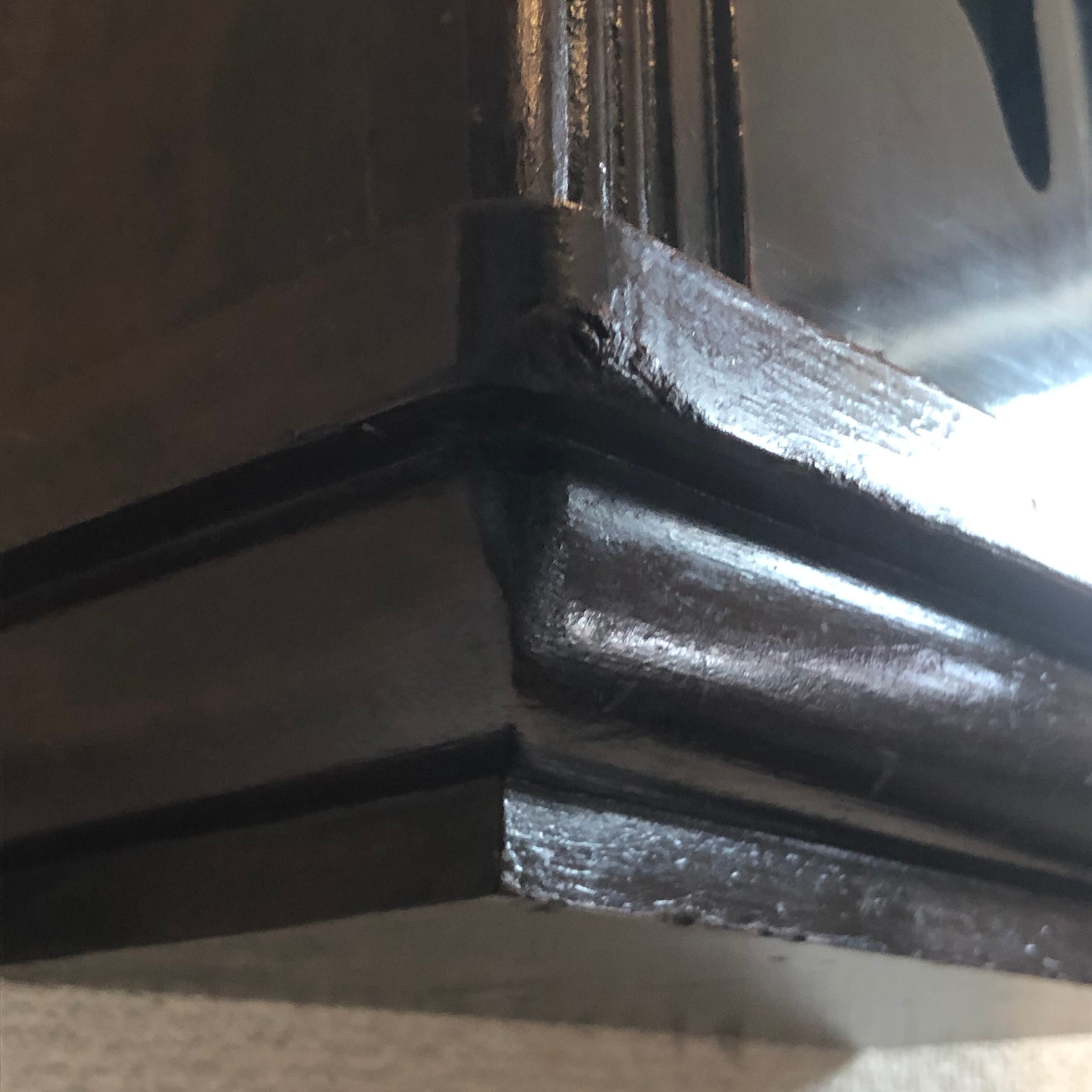 一枚扉の板には、5時の下辺りに木の縮みによるクラック(割れ)がありましたので、膠で接着の後、ヤスリで磨き当時と同じシェラックニスで再塗装して傷が目立たないように修復しています。