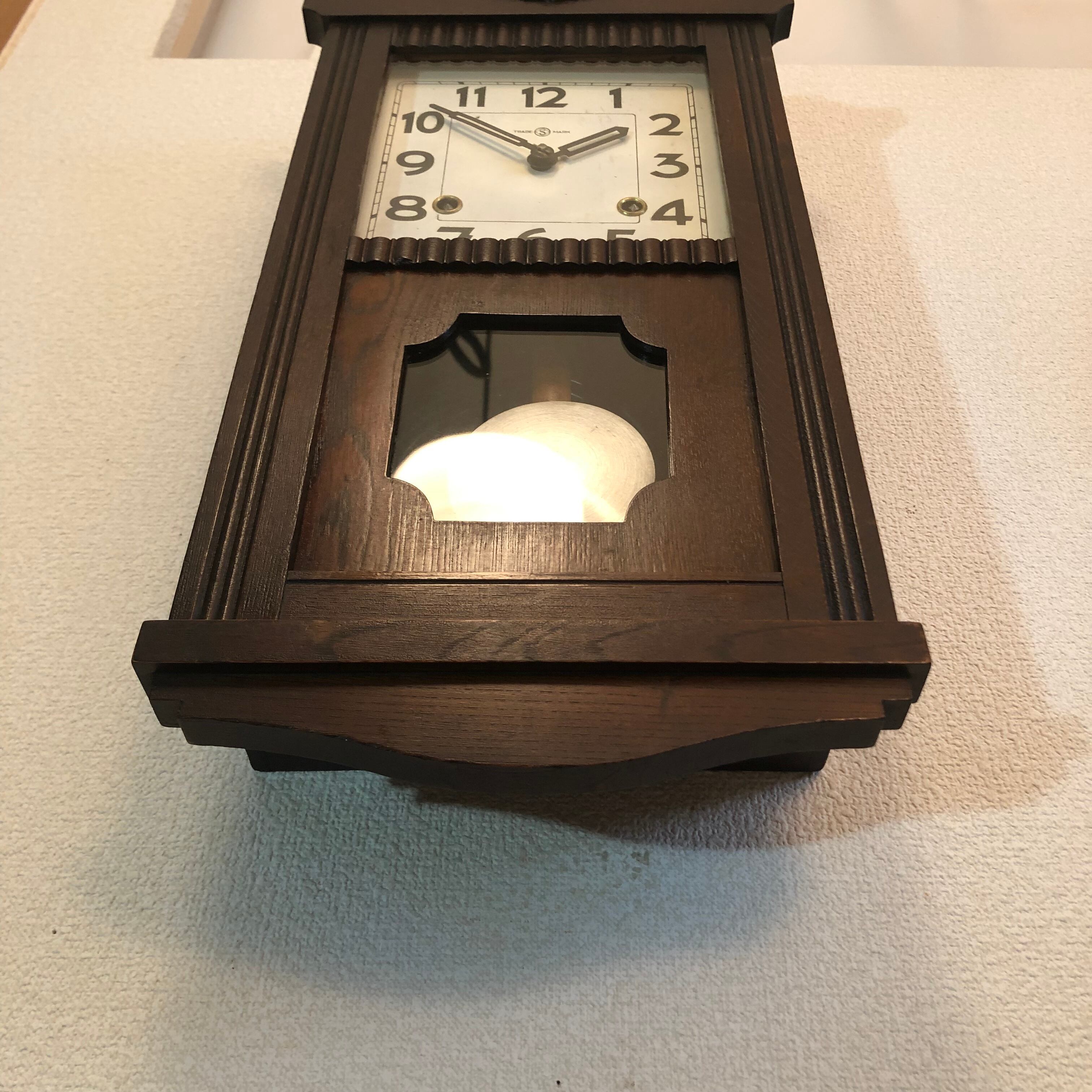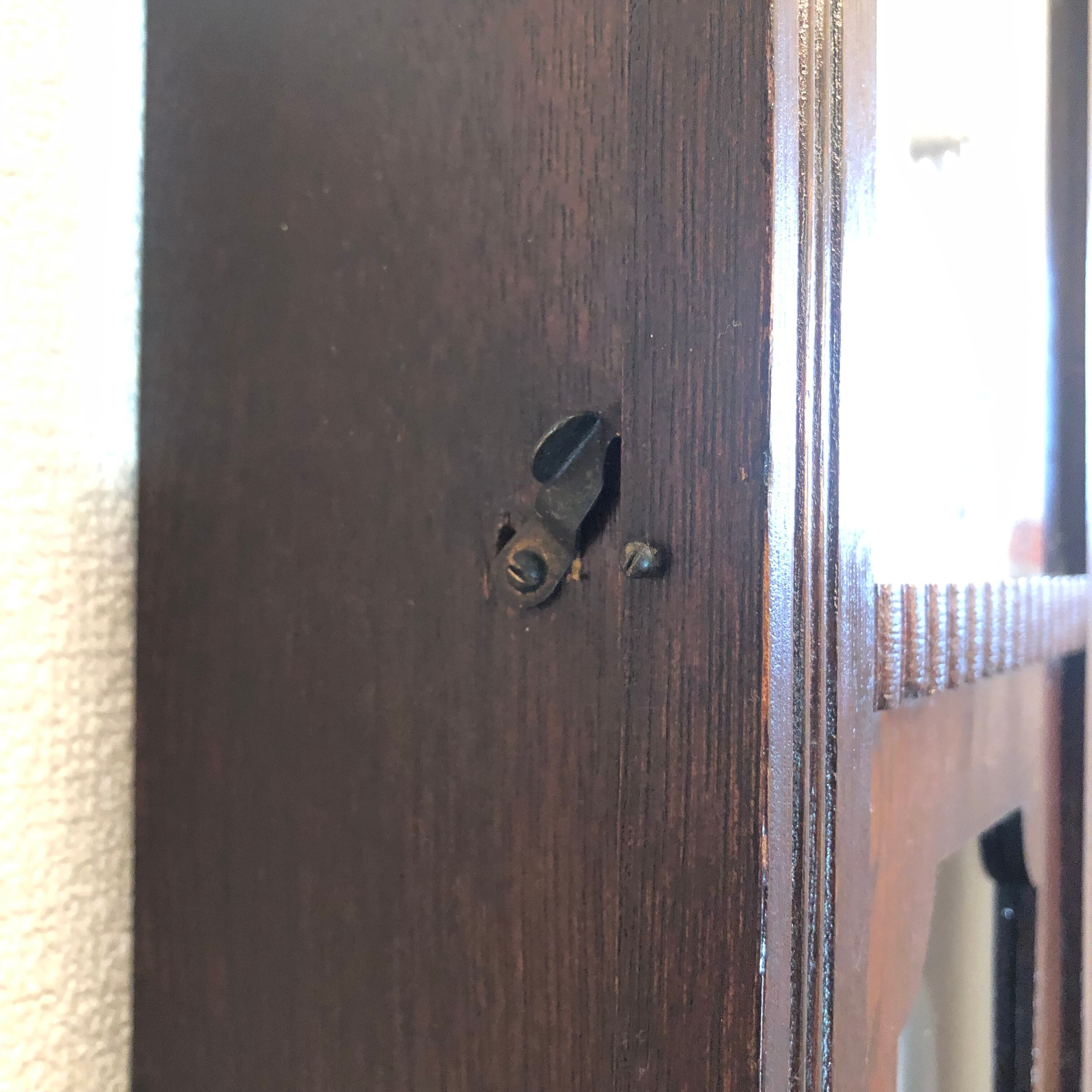 この時計は、昭和13年頃、戦争が近づく倹約という時代の背景もあり、昭和初期のお座敷小型スリゲルのデザインを踏襲しつつも、扉の一枚で箱の雰囲気を見せるシンプルな構造となり、簡素な作りになっています。