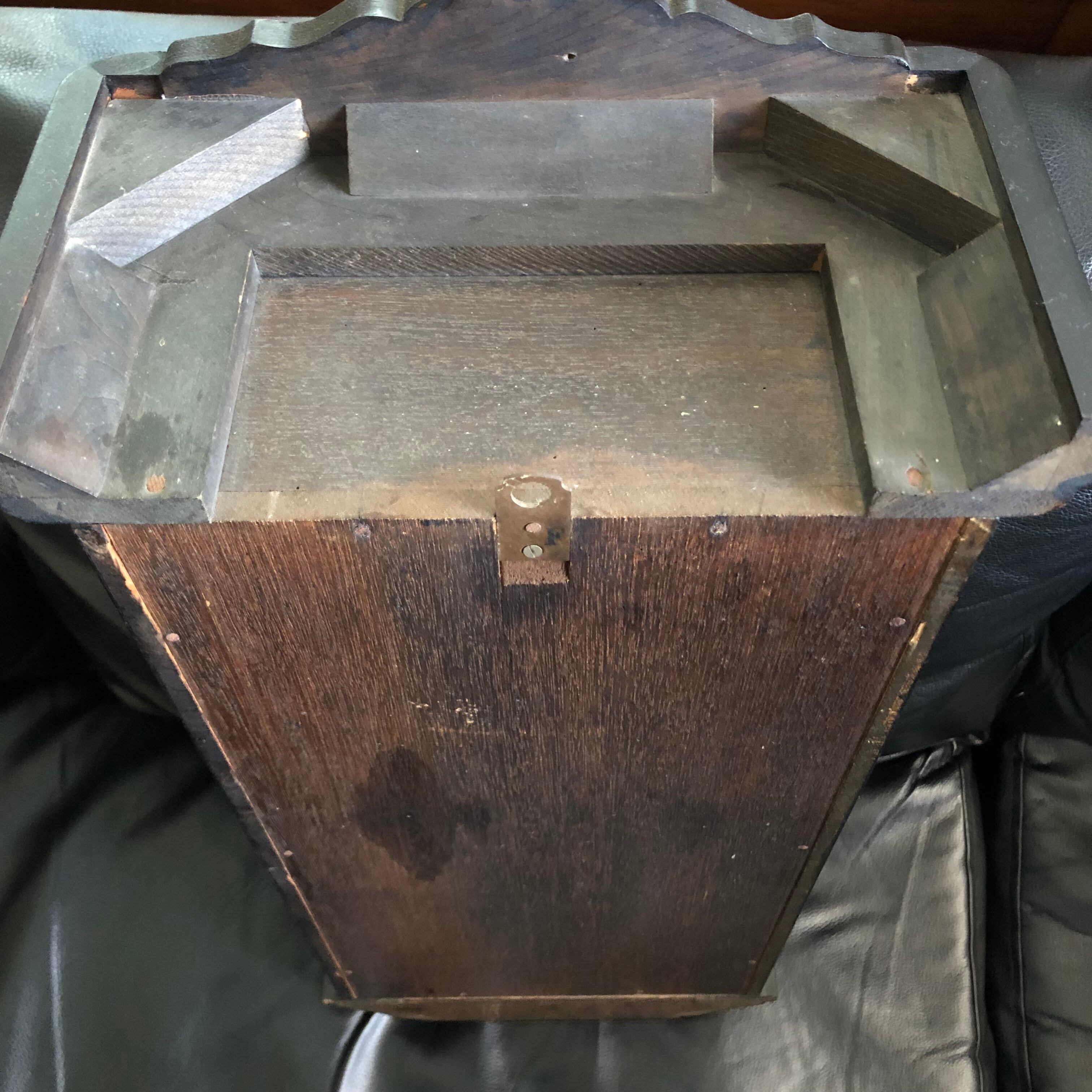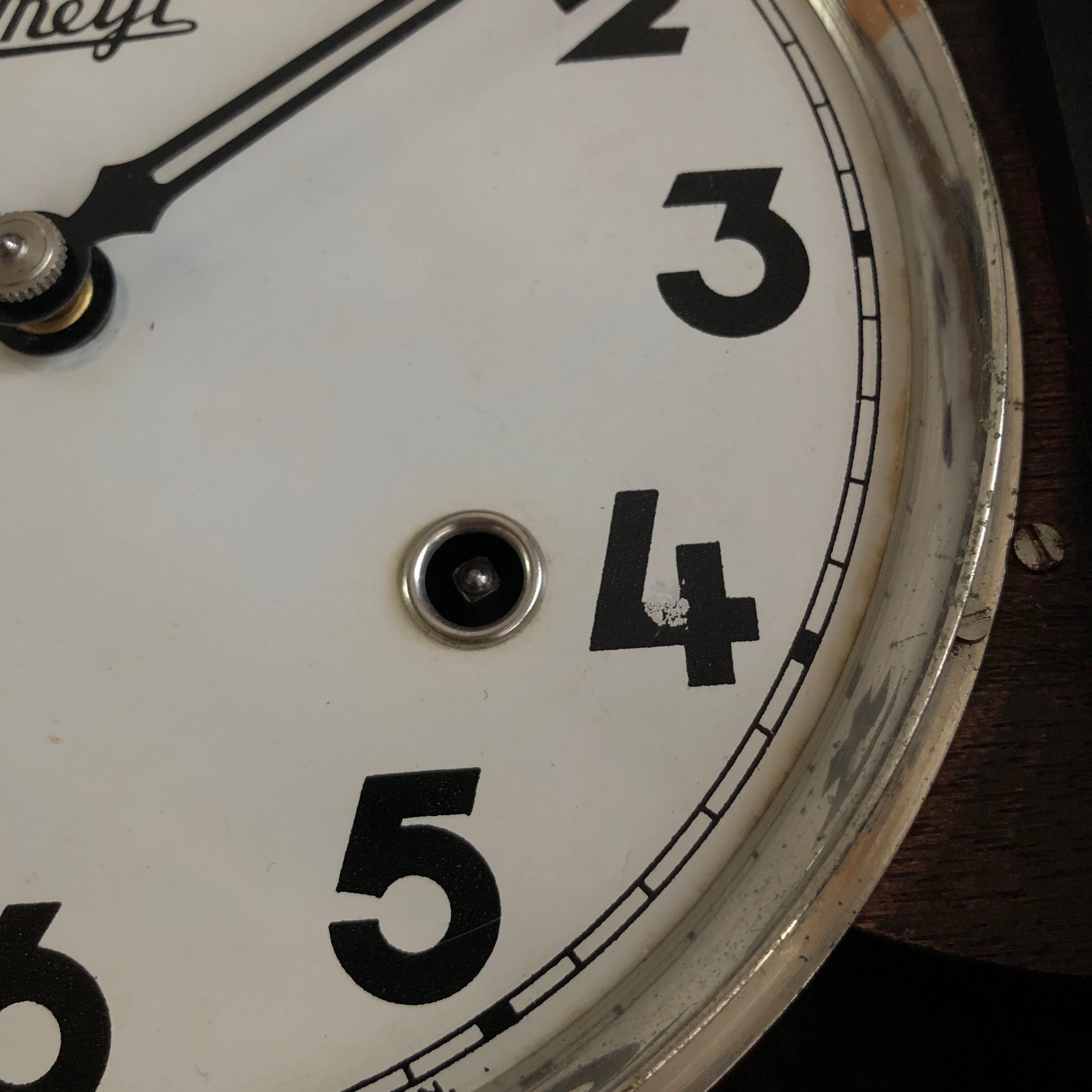 箱は全体に丸みのある優しい木の丁寧なラウンド加工で、明治時計らしい厚みのある茶色のツートン柄が美しいモダンで高級な雰囲気を残した時計です。