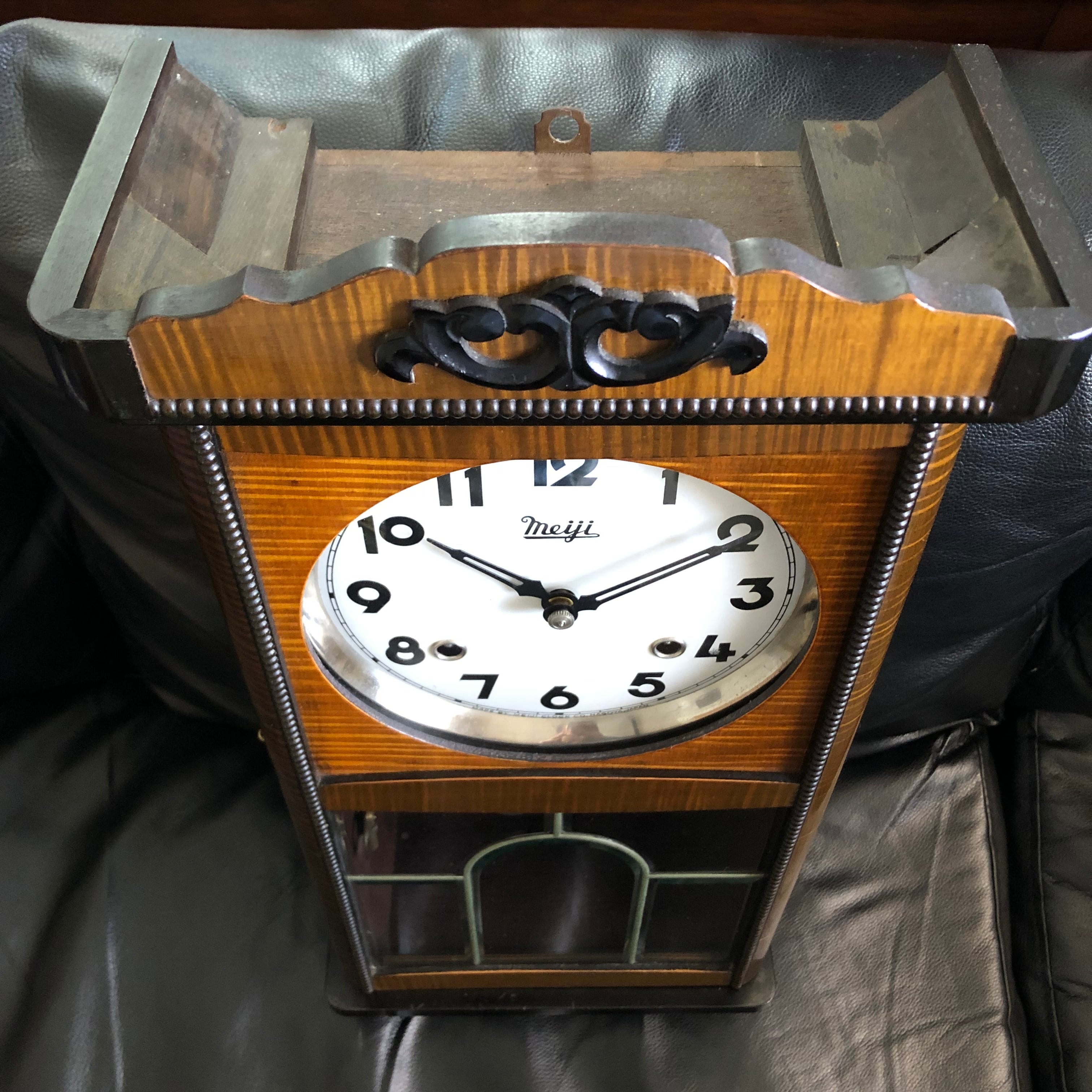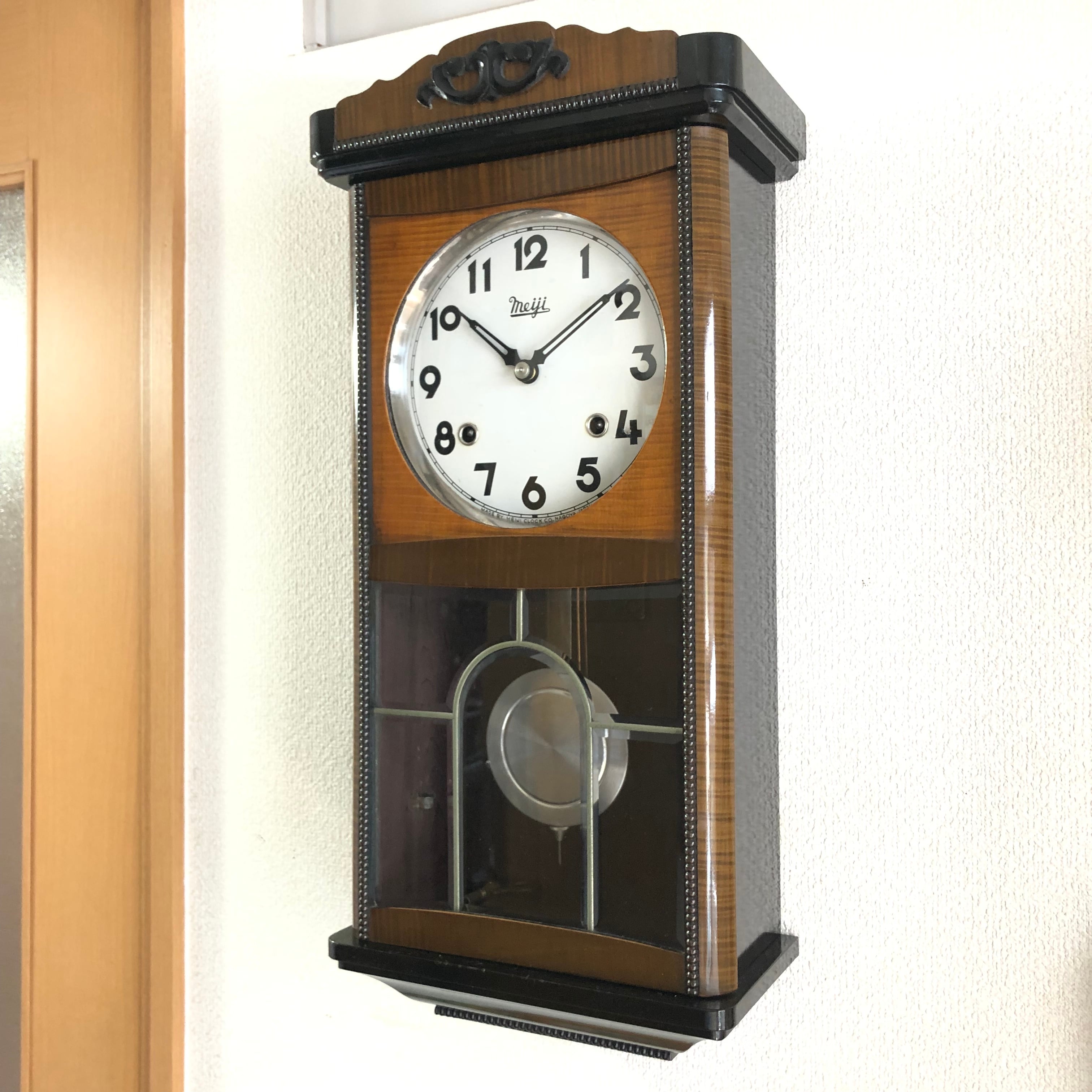 昭和レトロ明治時計製ステンドガラス調棒鈴ツートン柄掛時計オーバーホール済稼働品