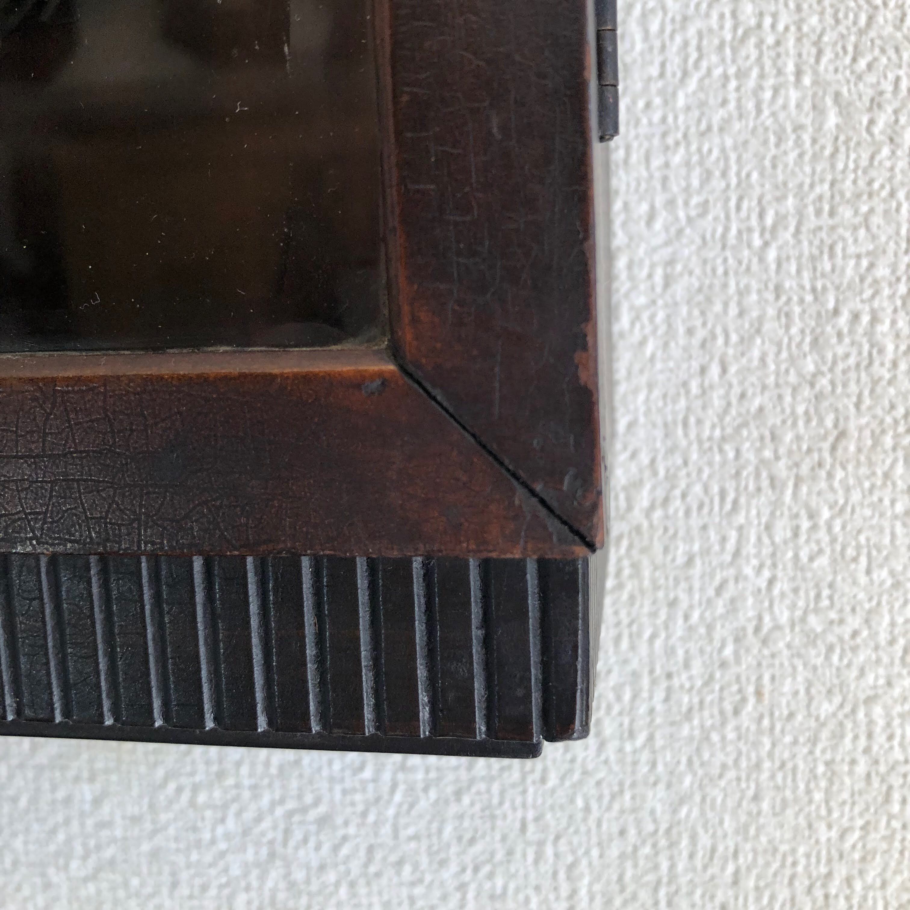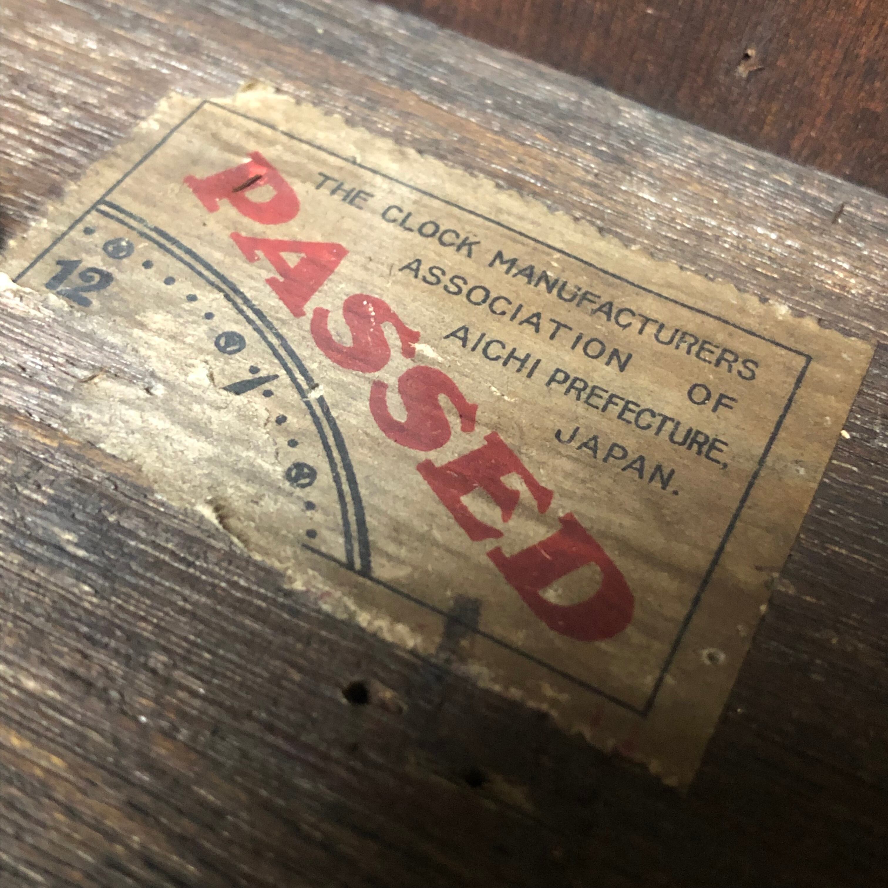 愛知県時計工業組合のpassedの輸出用シールが振り子室下に貼ってありますので、昭和6年〜10年頃の製造と思われます。こげ茶の落ち着いた色合いの楔形に特徴のあるモダンデザインの時計です。