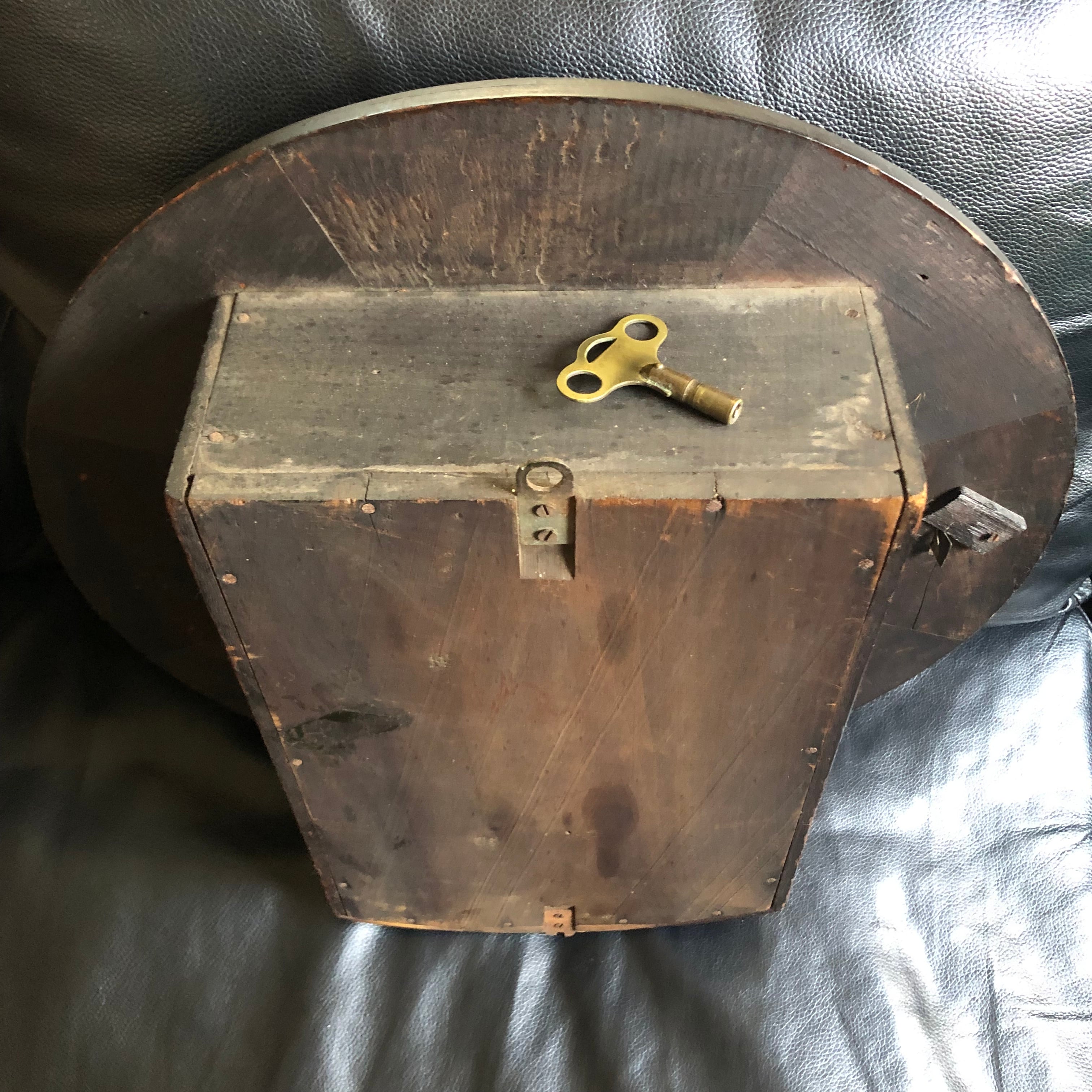 大正期から戦後にかけて作られたグレシャム 型です。グレシャム型は、背中に箱を付けたデザインの丸時計をいいます。丸の箱の中に機械があるトーマス型より時代が古いデザインです。竿が短いタイプですので、戦前の昭和初期の製造と思われます。