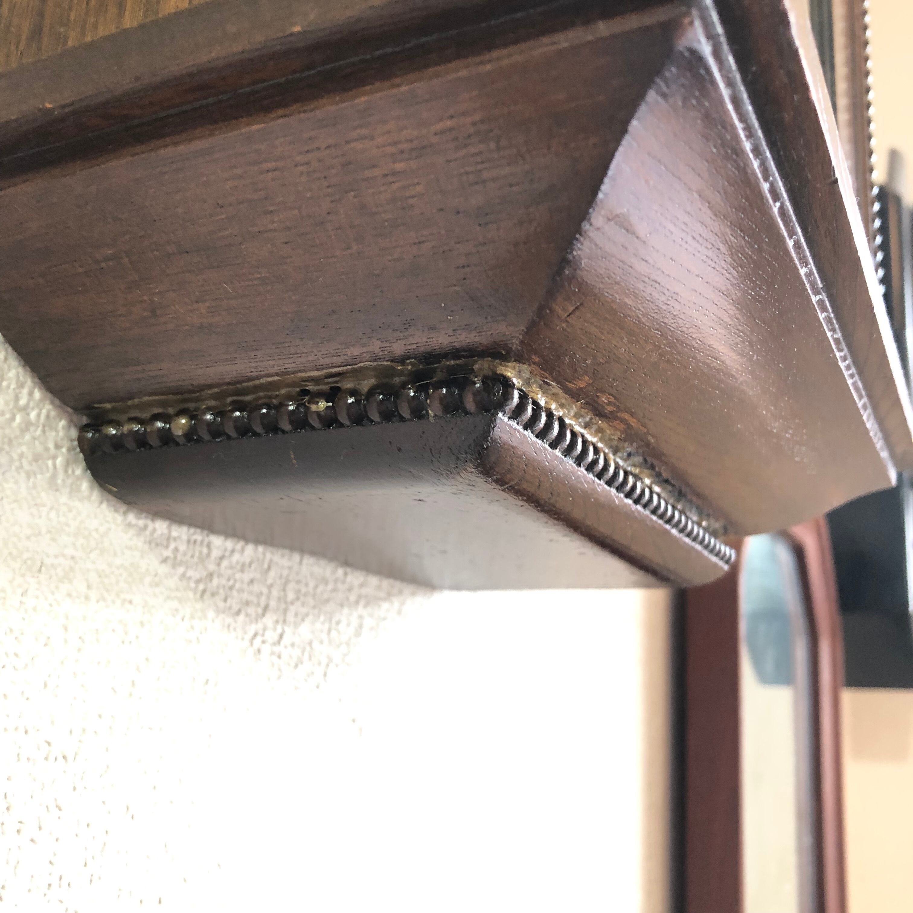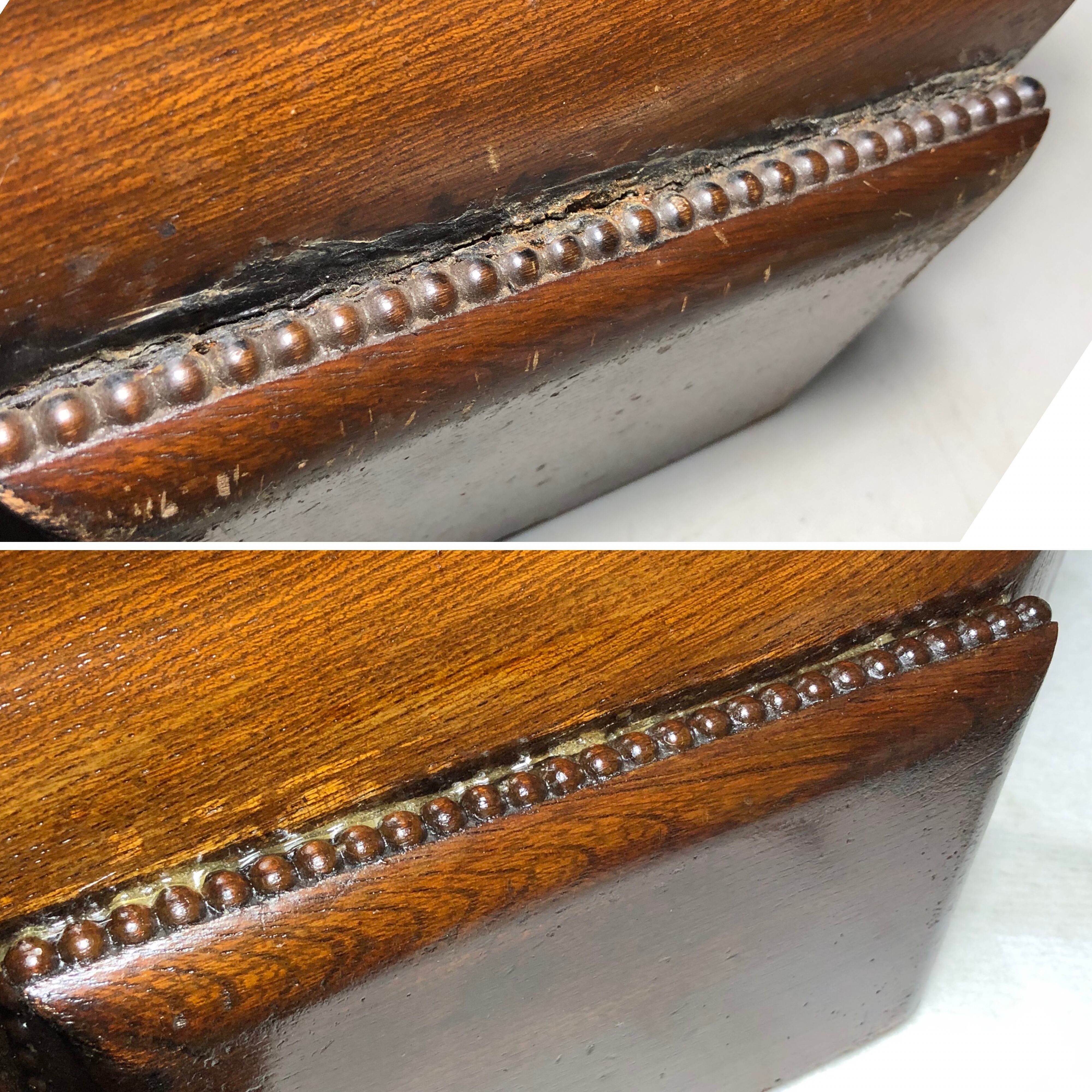 箱の底板が収縮により隙間が開いたためか、入手時には、パテ埋めとマーカーによる補修がされていました。再度底板を外し、補修を落し、シェラックニスで塗装後にニカワで厚めに接着しました。