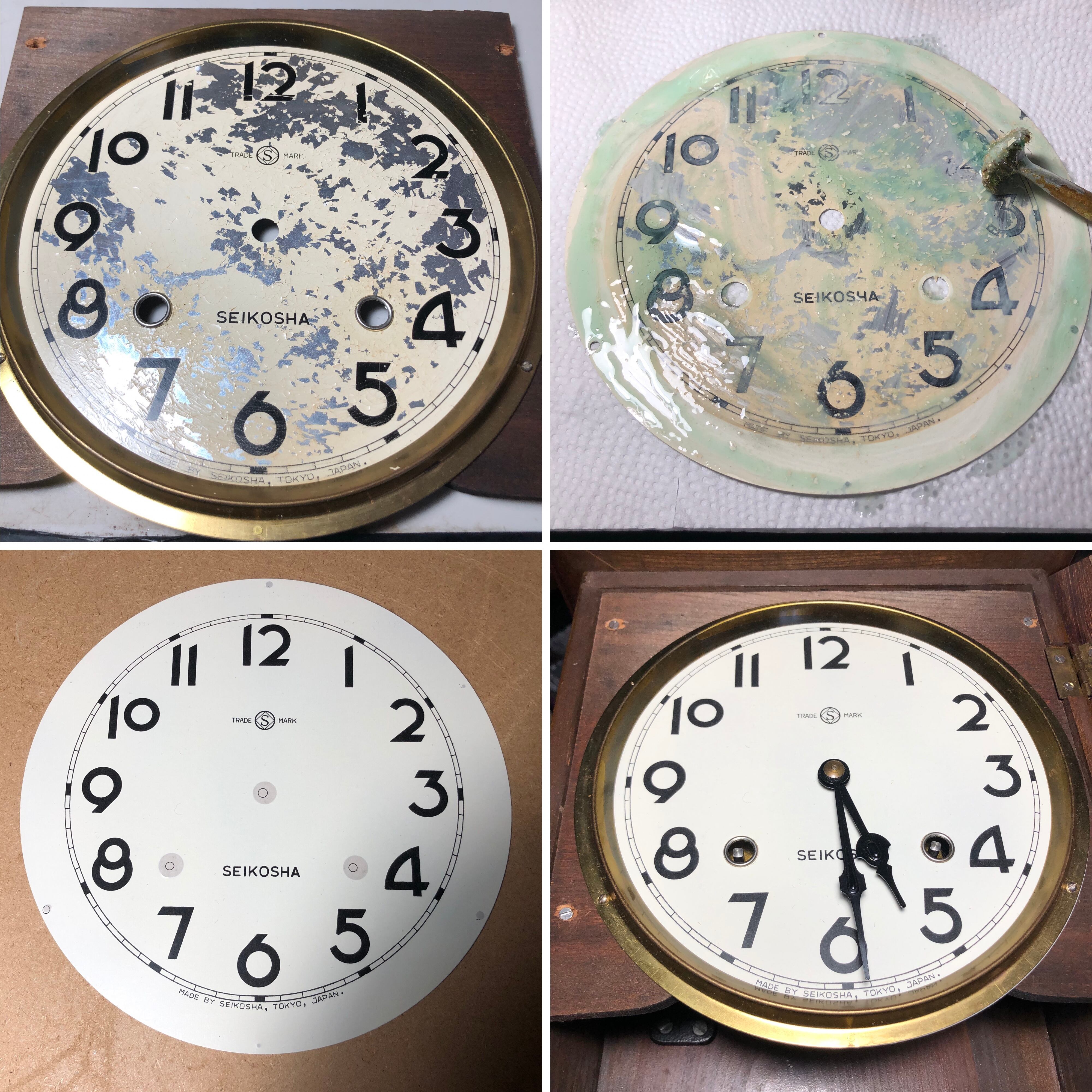 文字盤は、経年劣化で剥離していましたので、一旦塗装を除去した後、オリジナルから起こした転写シートをアルミ板に貼り付けて再生(リダン)しています。使用に支障はありません。