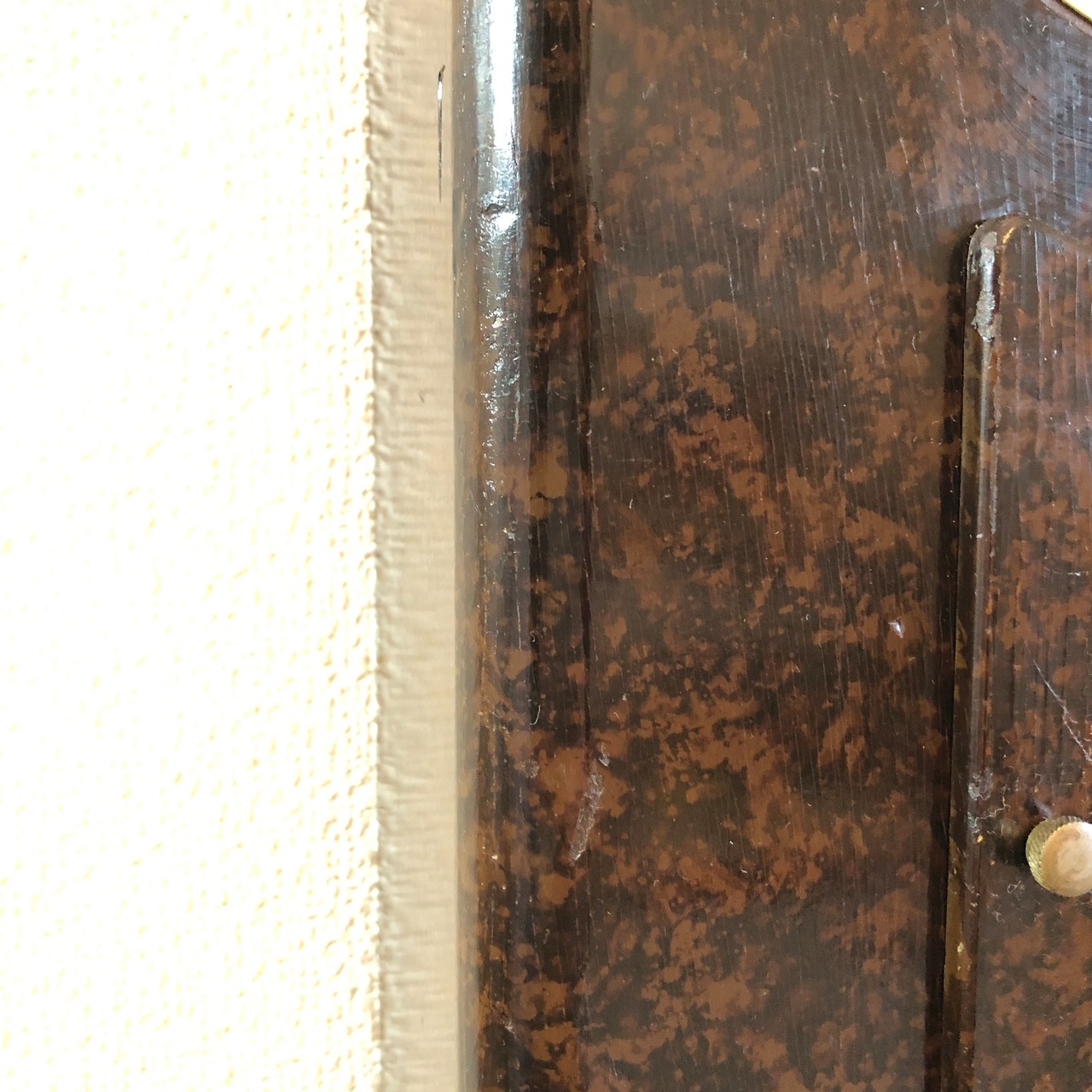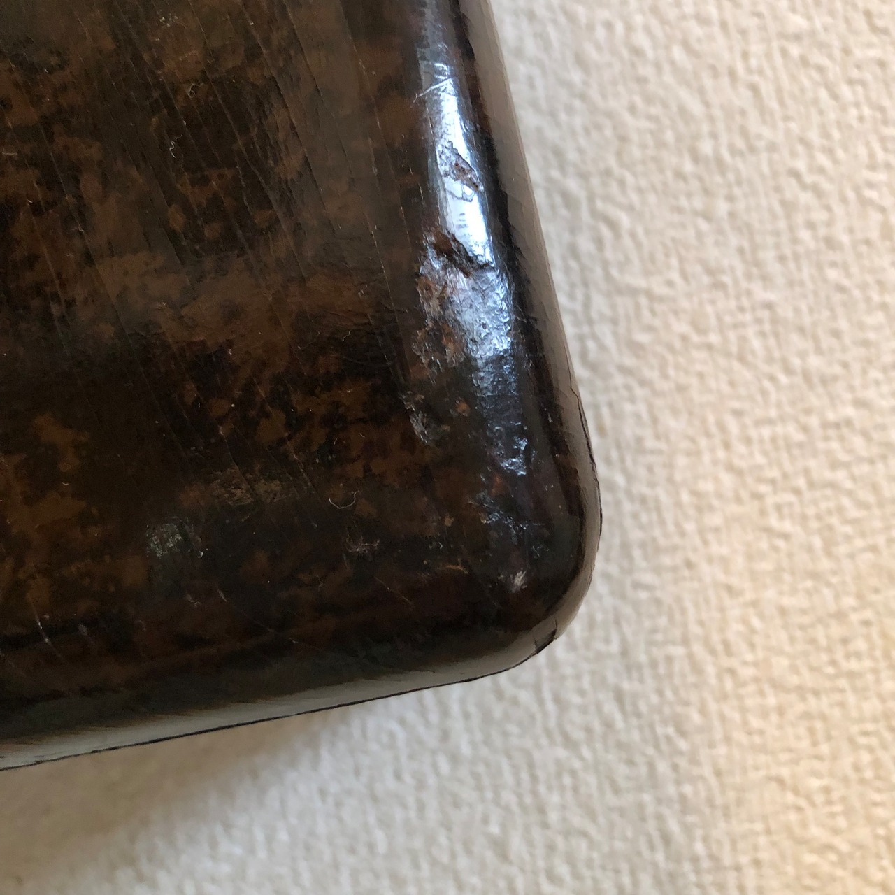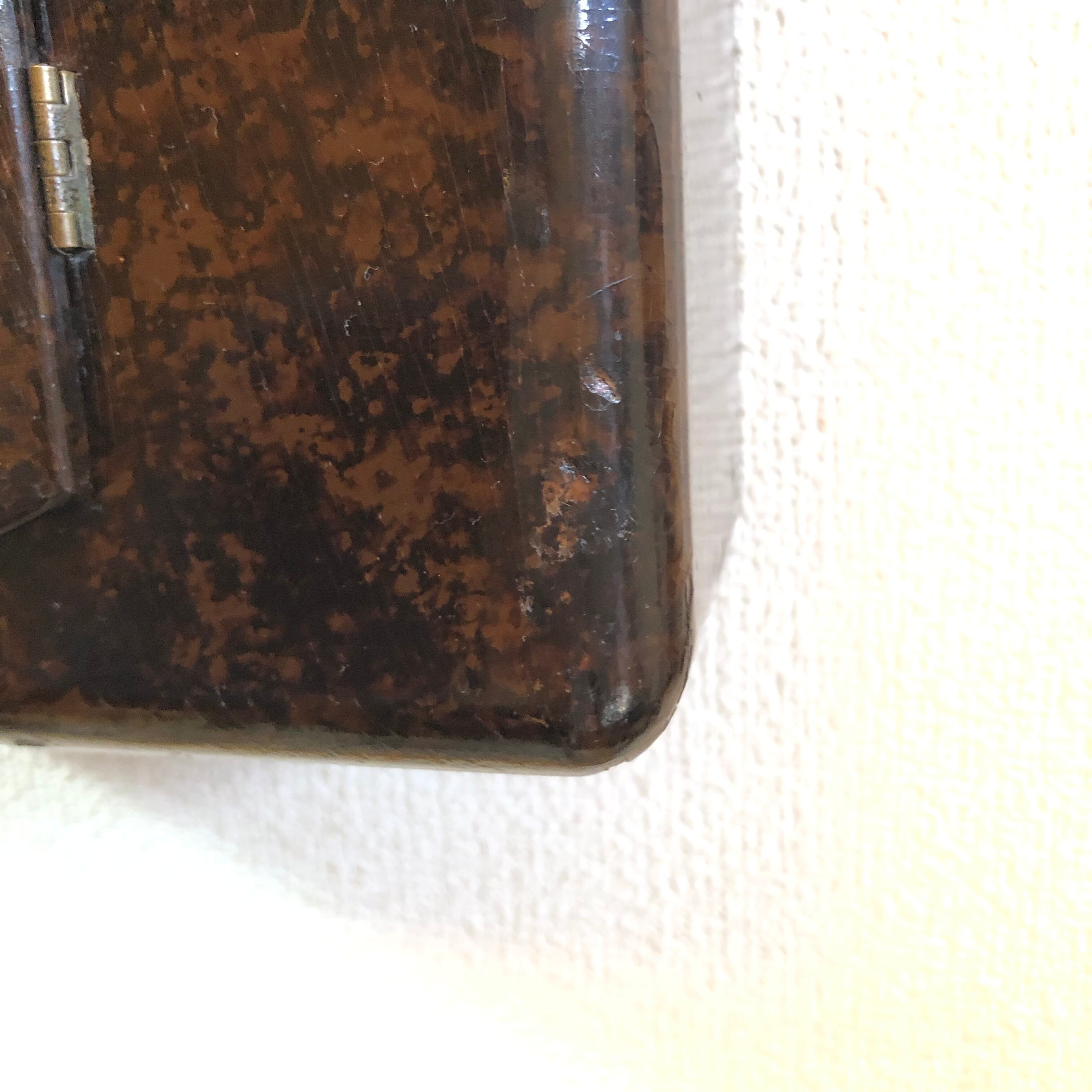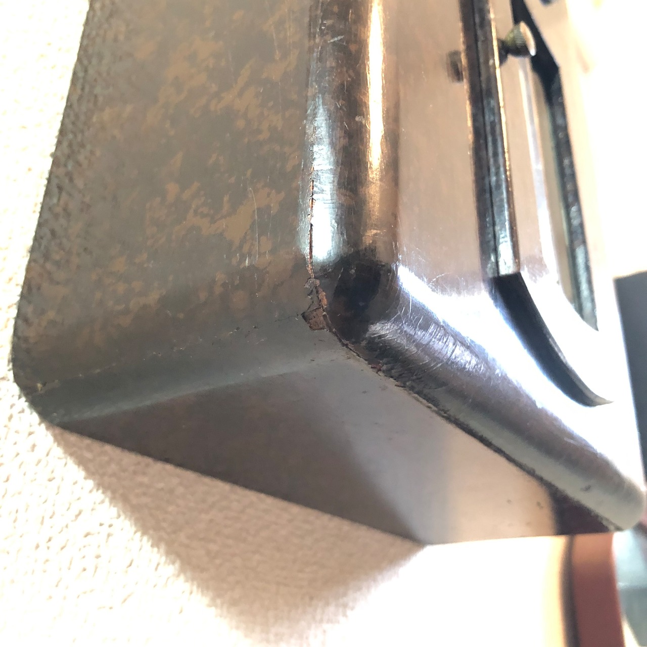 箱には、打ち傷や引っ掻き傷などありましたので、角の著しい箇所はパテ埋めして再塗装し補修しています。また小さな傷は、全体をオイルでメンテナンスし目立たなくしています。稼働する骨董品とお考え下さい。