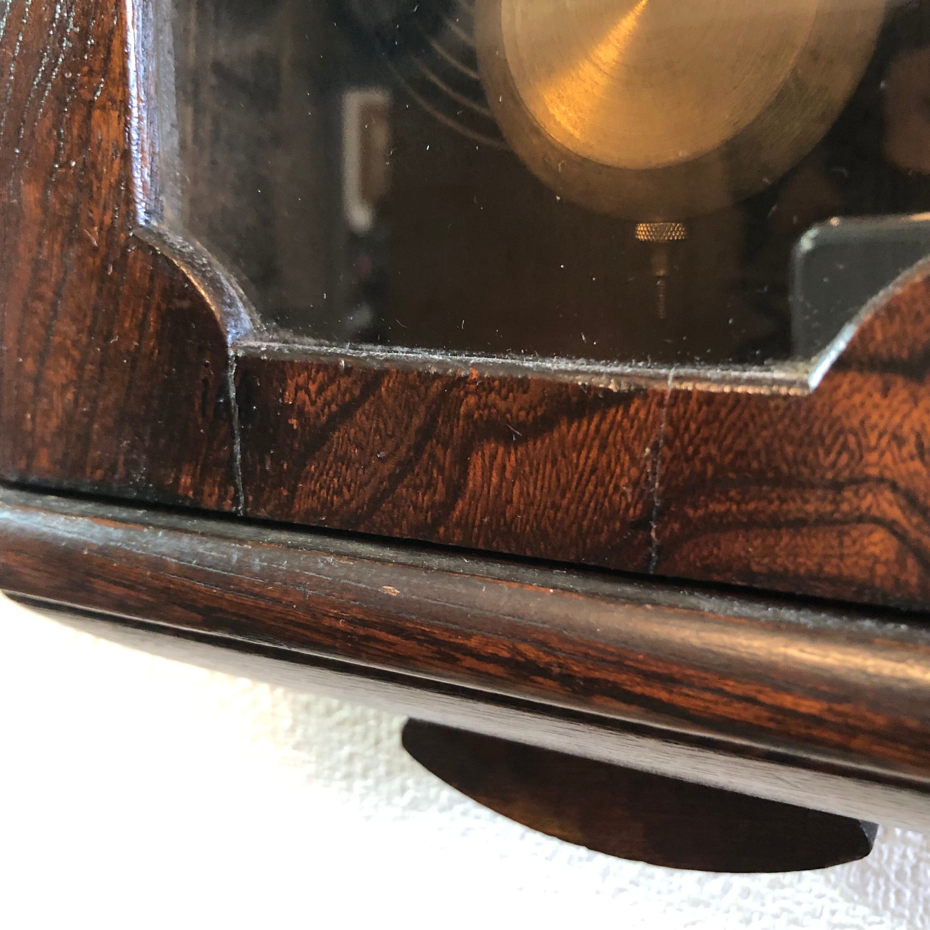 箱は、振り子窓上下に縦に小さなヒビがありますが、パテ埋めして補修しています。この他、経年による擦り傷や打ち傷、汚れなど時代相応の劣化が見られますが、チークオイルでメンテナンスして目立たなくしています。