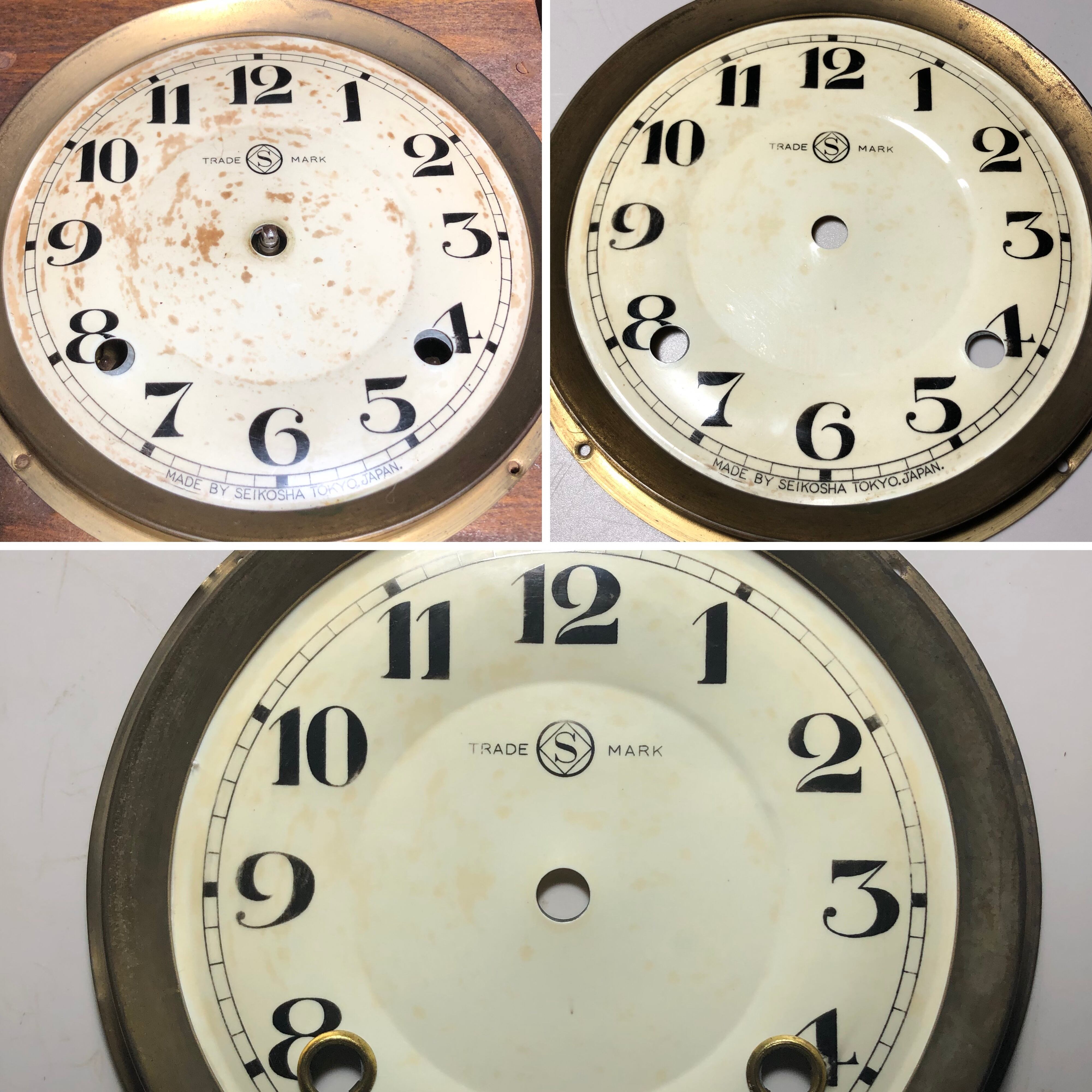 文字盤は、セルロイド製です。経年の黄ばみがありましたが、汚れ落としで綺麗にしました。跡は残っていますので、完璧を望まれる方はご遠慮ください。